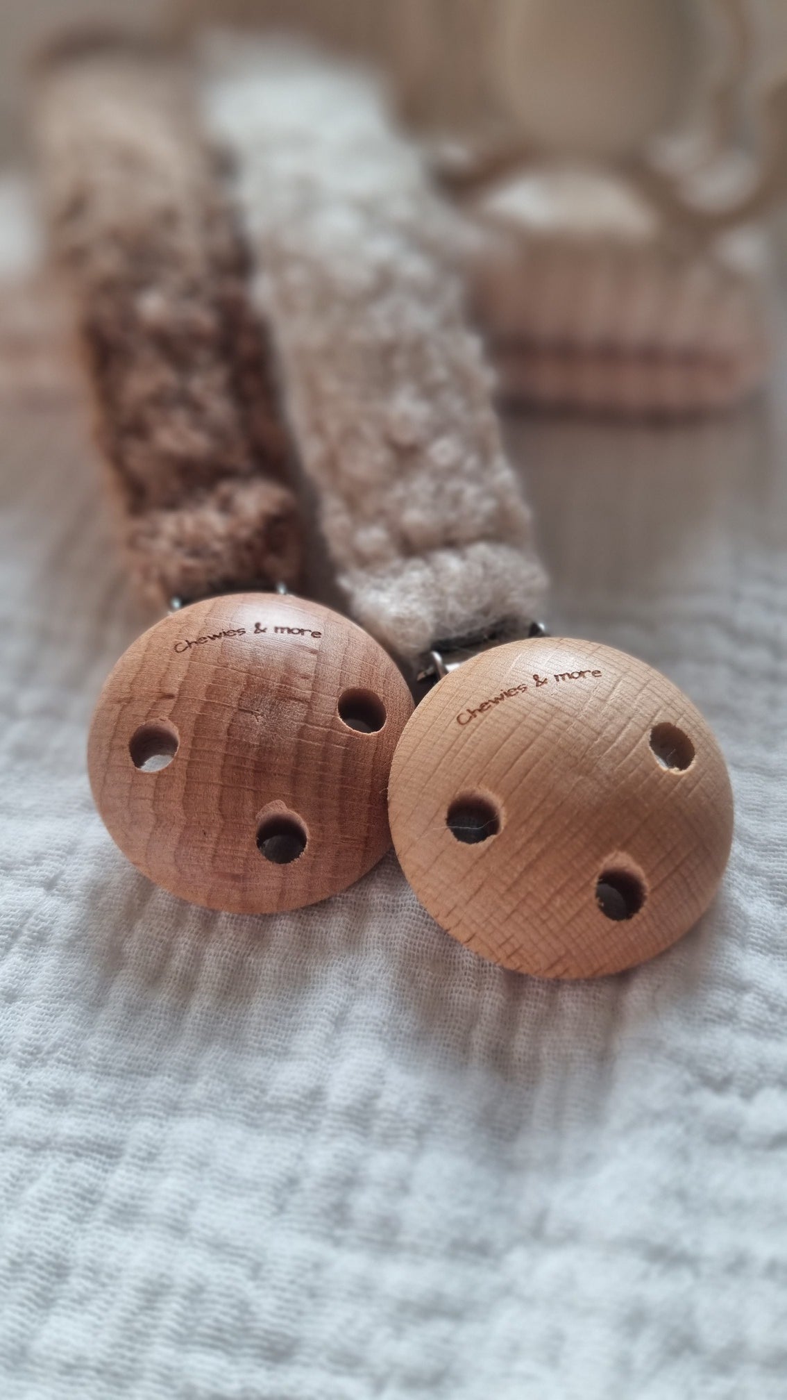 De speenkoorden en bijtringen van Chewies & More mogen nooit uitgekookt worden, nooit in de sterilisator en nooit in de vaatwasser.