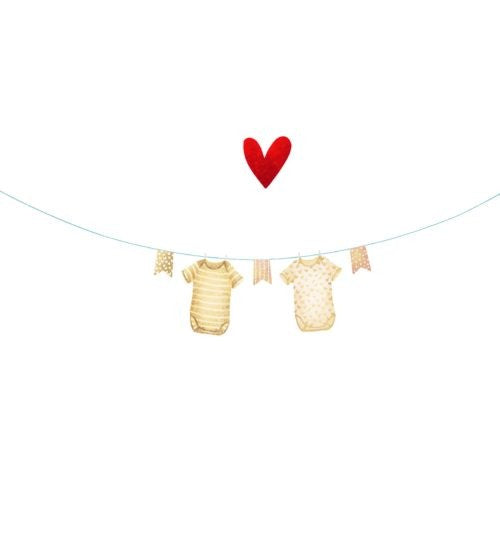 De kaartjes van Yon bevatten zowel aan de binnen-, als buitenzijde geen tekst wat de kaartjes voor diverse gelegenheden perfect maken. Op de voorzijde van dit kaartje staan een waslijn met schattige babykleding en een hartje. Dankzij de neutrale kleur is het perfect voor de geboorte van een (klein)zoon als (klein)dochter. Aan de waslijn hangen twee rompertjes, dus je kunt het kaartje ook perfect gebruiken voor een tweeling.